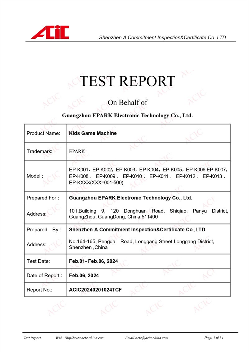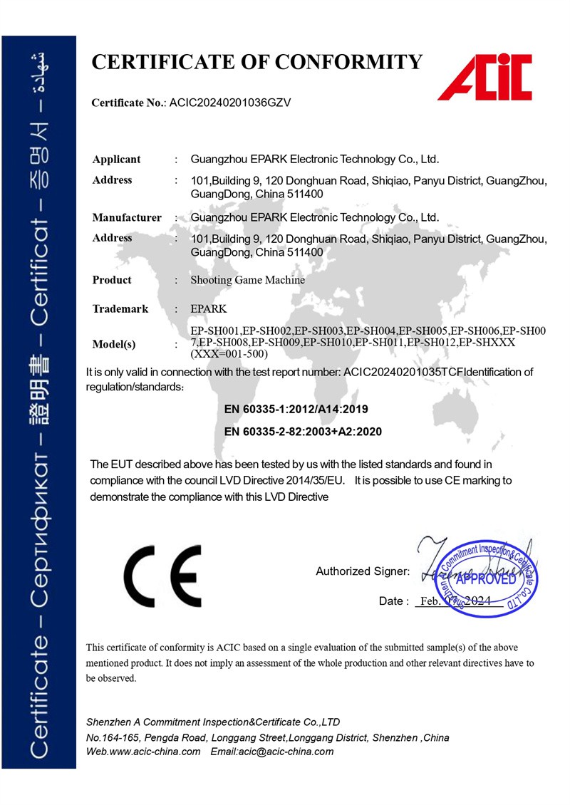 Il-magni kollha tal-arcade EPARK jikkonformaw maċ-ċertifikazzjonijiet internazzjonali tas-sigurtà u l-kwalità. Ittestjar strett jiżgura prestazzjoni stabbli, durabilità, u tħaddim sikur f'ambjenti kummerċjali.